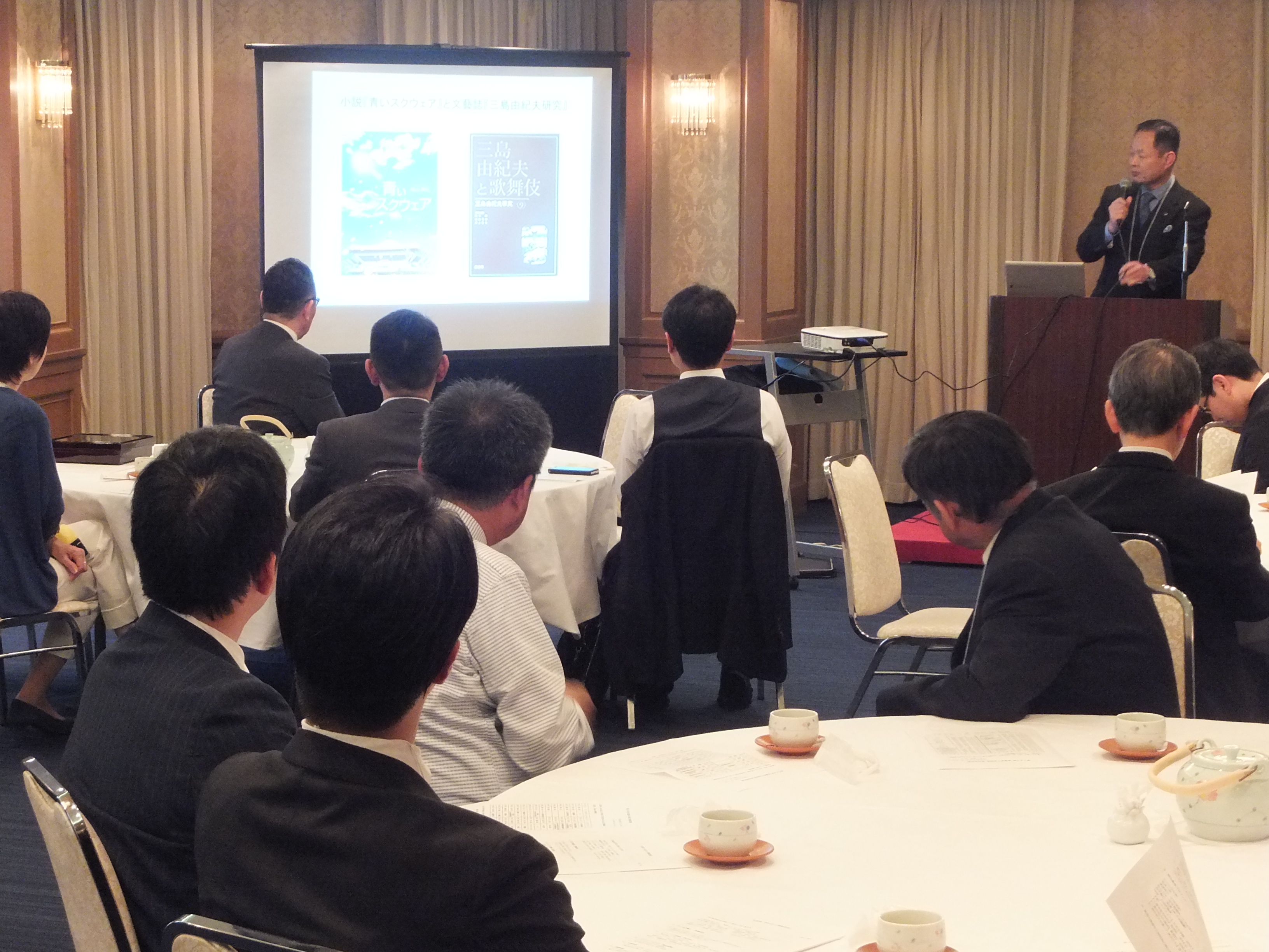 会の後半は、大学30回卒の伊予銀行広報CRS室勤務で本学非常勤講師であり、作家・文芸評論家の岡山典弘氏を講師として迎え、「松山からの情報発信」という演題で講演頂いたが、岡山氏の著作である『三島由紀夫が愛した美女たち』より、三島由紀夫が恋し憧憬した10人の女性とのエピソードを興味深く解説して頂いた。また、美輪明宏の若年期から現在の成功に至るまでの著名人との交流遍歴や活躍ぶりを独自の手法で切り込んで解説して頂いたが、非常に面白く興味をそそる内容で、参加者の皆が時間を忘れてこの卓話に聞き入った。