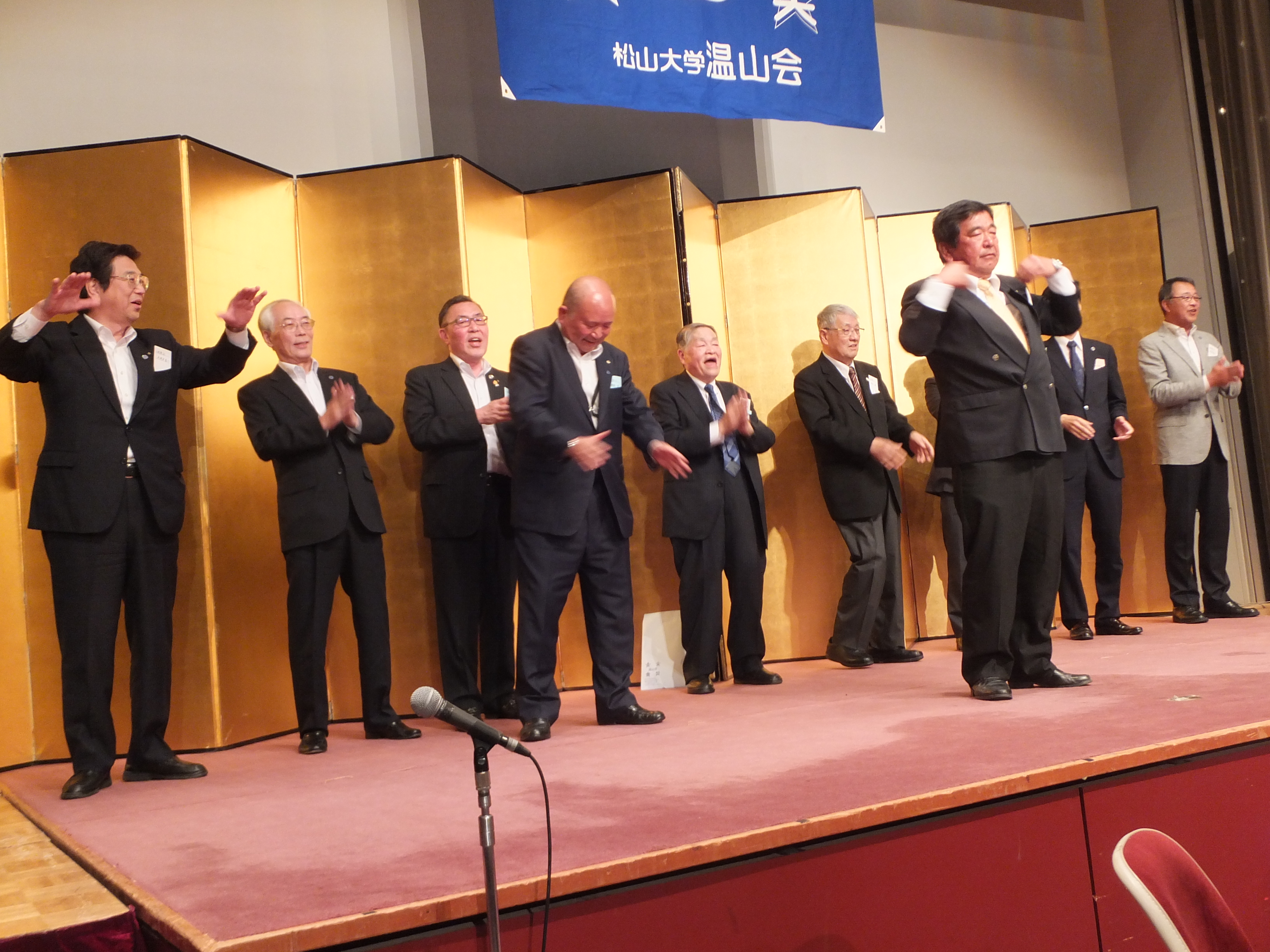 会の終盤には中野良雄氏(大23回)を中心とした應援團OBのリードと勇壮に太鼓が打ち鳴らされる中、松山商科大学校歌と逍遙歌を参加者全員で斉唱し、剣道部OB会代表の清水完二氏(大29回)による中締めの挨拶と三本締めにより、盛況のうちに懇親会は閉会を迎えた。