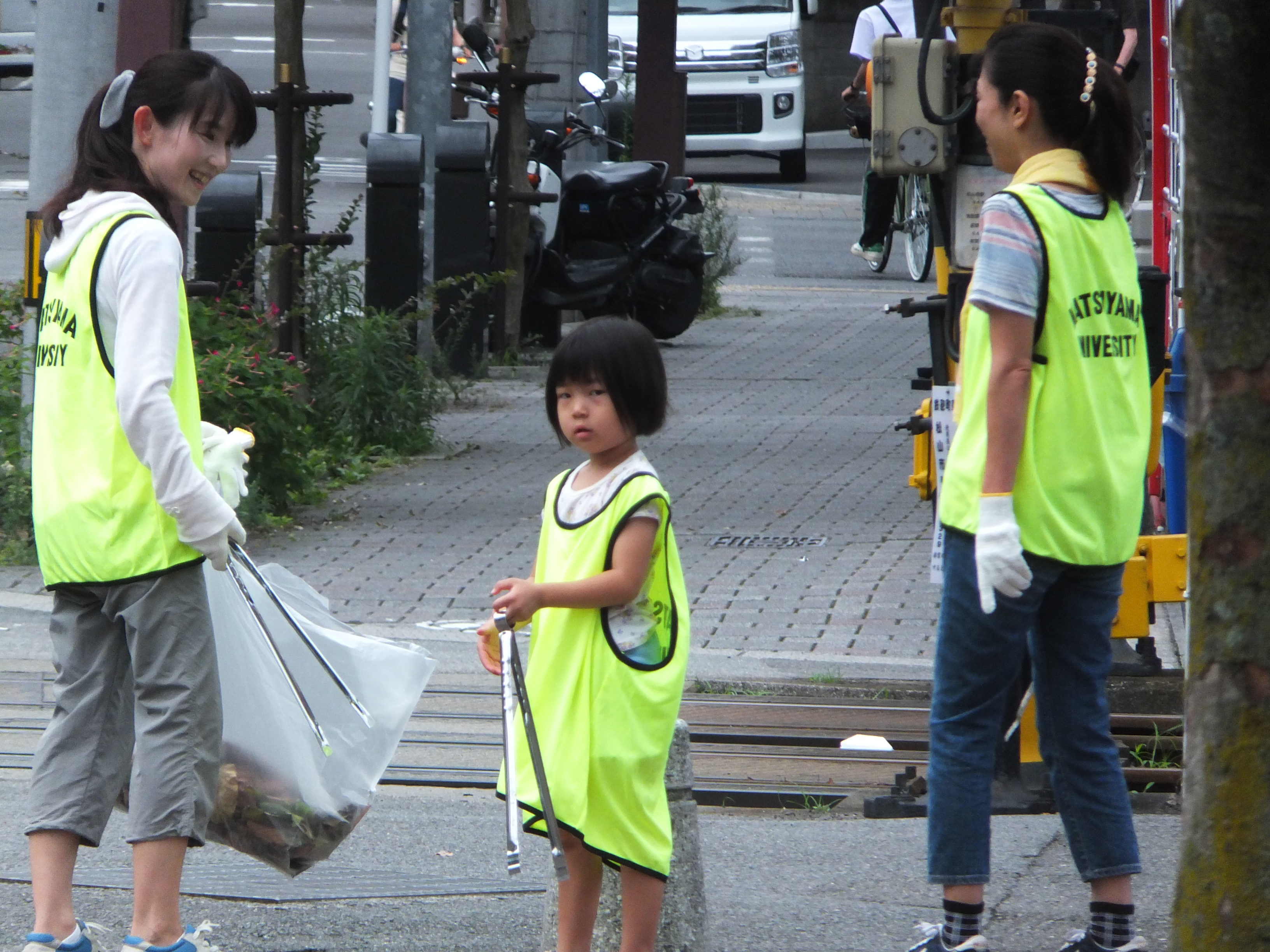 松山大学は『クリーンキャンパス』の一環としてマイロード清掃を定期的に実施しているが、2003年度に松山市のマイロード制度に認定されてから14年が経過し、前回までで約4,350名の方々に参加して頂いた伝統ある地域貢献イベントである。温山会としても松山のまちを美しくしようとこのイベントに定期的にタイアップしているが、今回は7月8日(土)8:30から総勢75名が参加し一斉清掃を実施した。