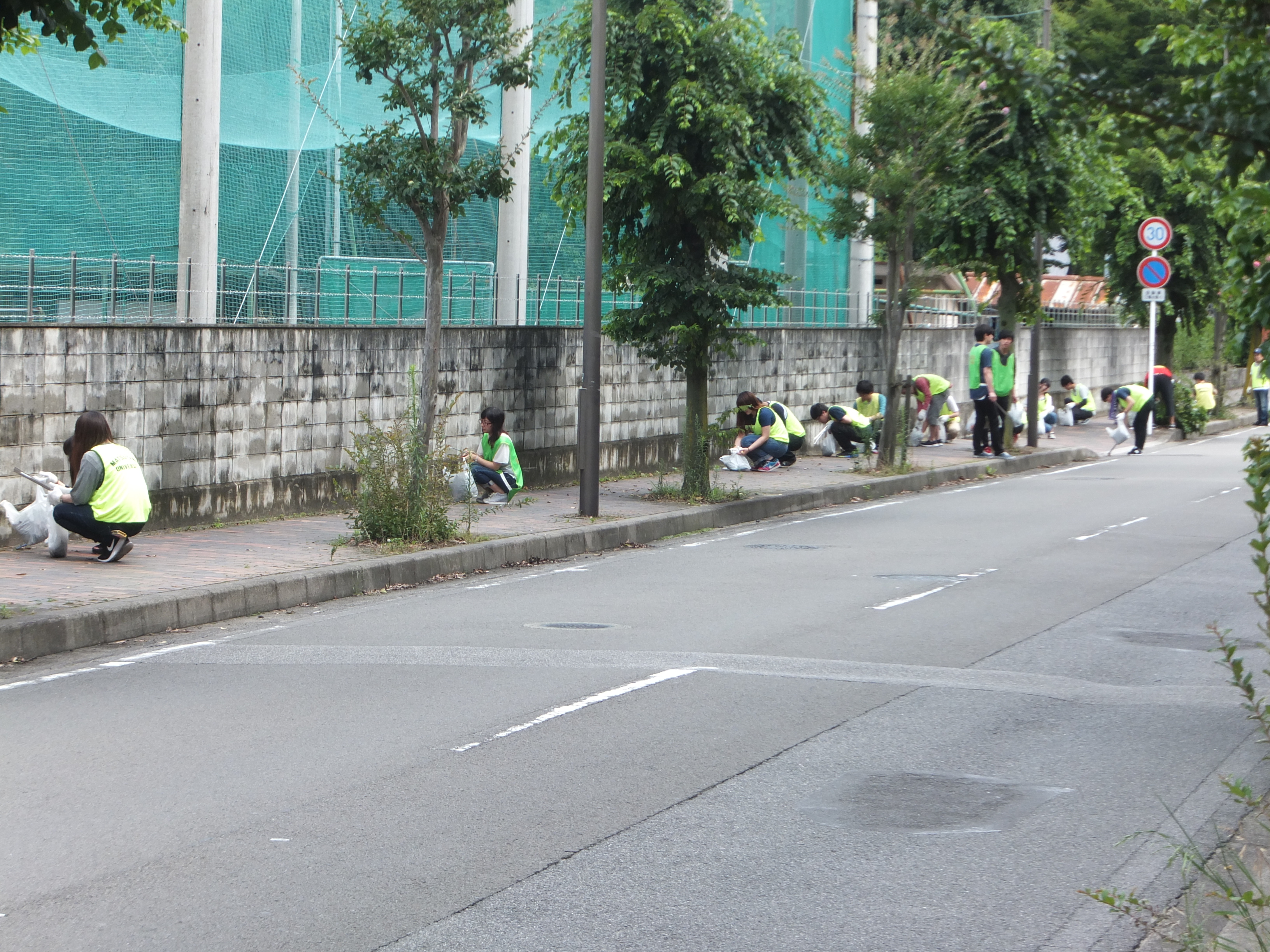 時期的に大変蒸し暑い中、参加者全員で各所に生い茂った雑草の駆除やゴミ拾いに専念した結果、大学周辺の歩道は見違えるほど綺麗に生まれ変わった。