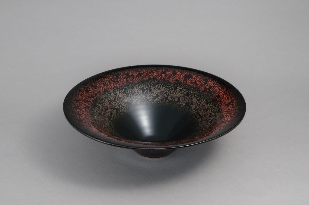 今回、岡山県知事賞を受賞した作品「鉄釉紅彩幾何文鉢」は、黒釉を掛けた鉢に紅釉や茶釉をさらに掛け、繊細な模様を浮き出させた美しい逸品であり、独自の作風の新しい虫明焼といえる。