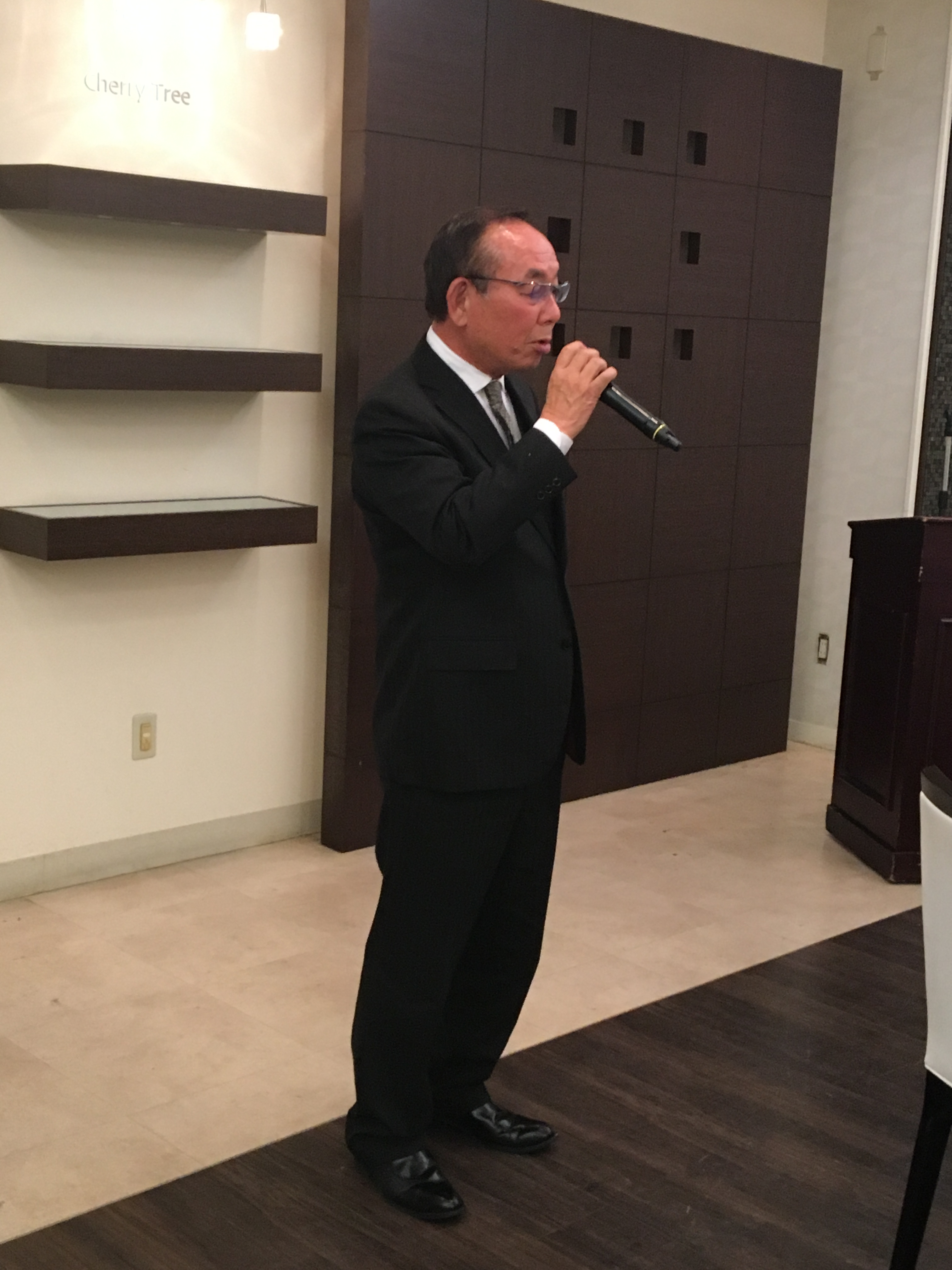 最後に来年の開催について幹事の原田先輩よりのご案内で、今回は初めて「SMS」で出席を募りました。従来の往復ハガキより受信者の反応が早く、確認がスムーズであったため、来年も「SMS」での案内に会場は賛同。しかし、「中本会長はSMSメールを見ることがない。下岡先輩は迷惑メールに振り分けられていた。」と、一部困ったことも激白されました。(笑)また、温山会広島支部総会(9月)への出席のお願いも同時にありました。