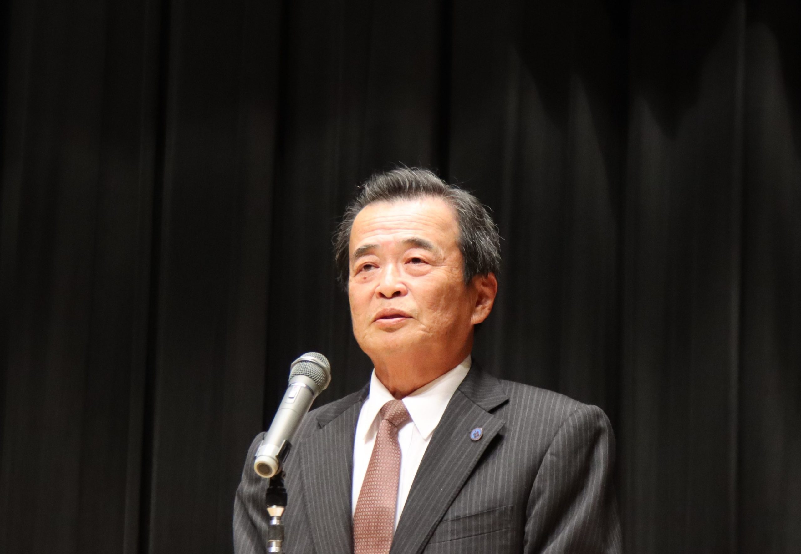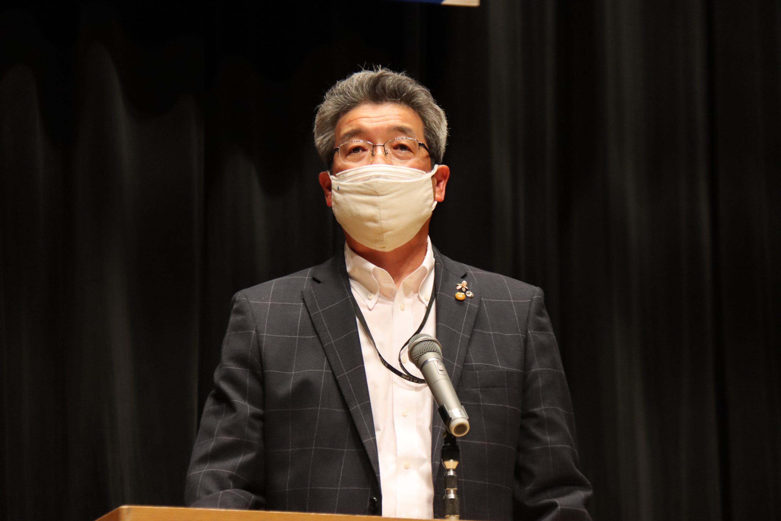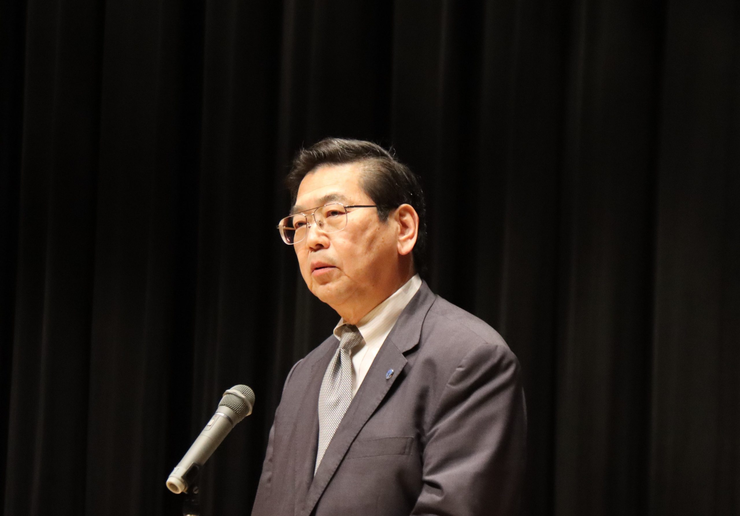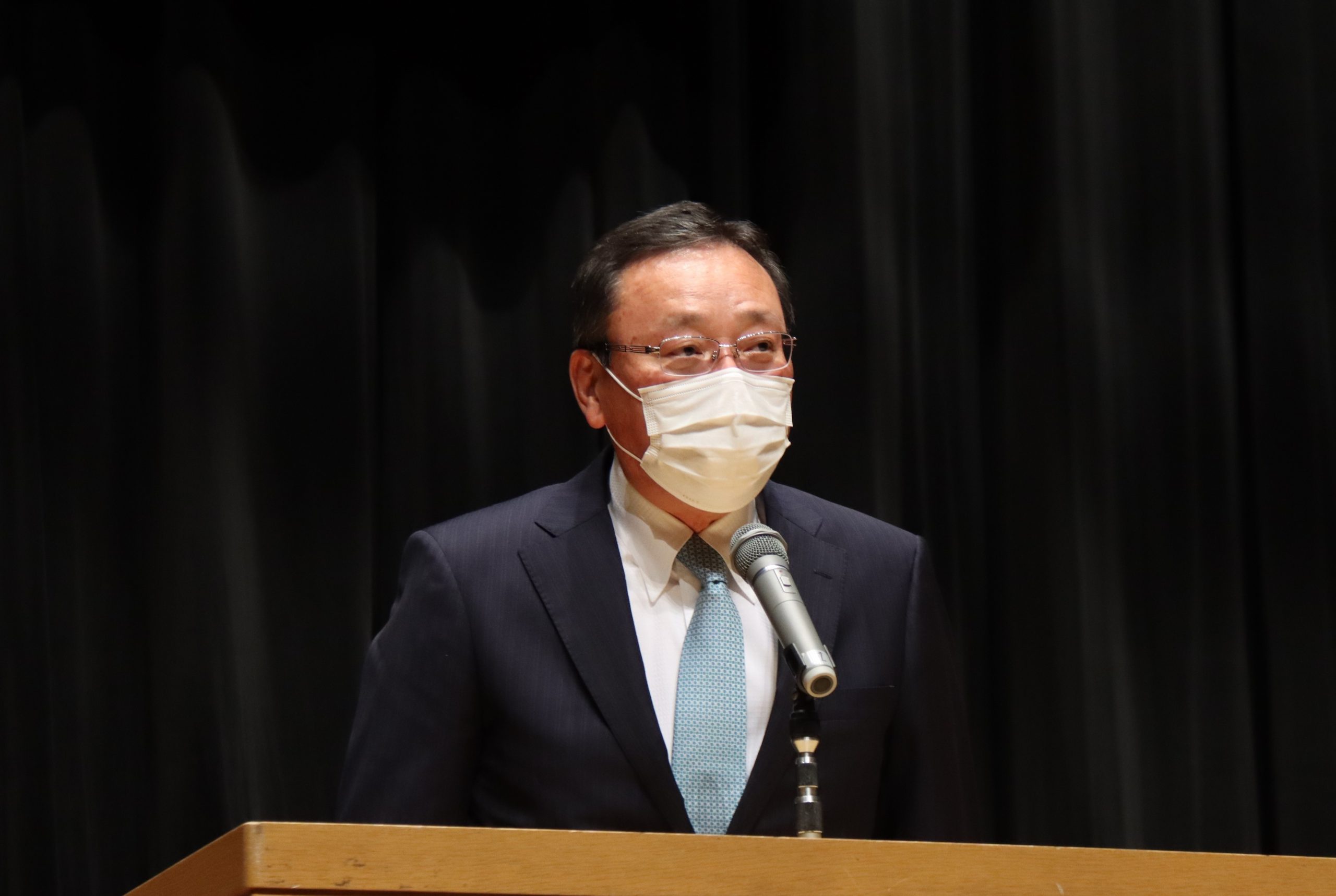 続いて新井英夫理事長・学長から「新型コロナウイルス感染症の影響は大きく、未だ入学前に学生たちが思い描いていたであろうキャンパスライフを送らせてあげることができていない現状にある。このような状況において、大学では学生支援に力を入れてきたが、支援の実施には、温山会の多くの会員の皆様から寄せられた寄付金によるところが大きく、感謝申し上げたい。コロナ禍ではあるが、多くの学生が、学術、課外活動、社会連携活動など、様々な分野で活躍をしてくれている。大学として、引き続き、学生たちが学びの楽しさや大切さに気づき、成長という実りへの一歩を踏み出す背中を押していきたい。2023年、松山大学は100周年を迎える。引き続き、母校松山大学にご支援を賜りたい」旨のご挨拶をいただきました。