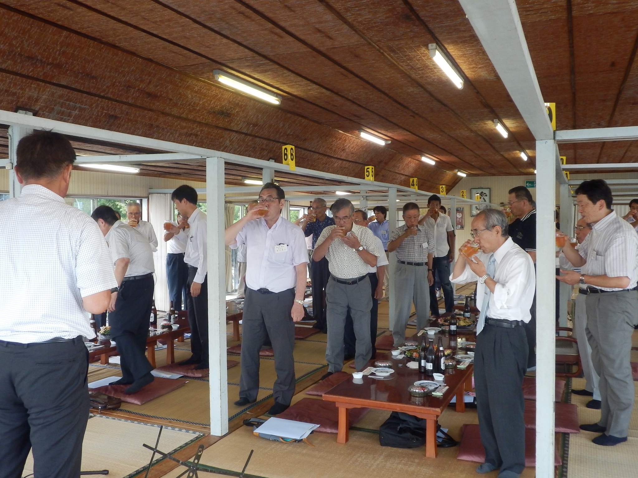 総会は「元気ですかーっ!」と沼田譲二幹事(大22)の呼びかけで始まった。最初に北条支部矢野武司支部長(大15)から「母校松山大学村上理事長・学長、温山会副会長秋川啓人副会長(大25)、西原友昭事務局長(大26)の出席をいただき総会が出来ること。松山大学ギタークラブの現役学生や多数の会員の参加で盛大に開催できることに感謝をしたい。連日35℃を超える猛暑、夏の北条では避暑地として有名な鹿島での開催に変更して3年目になる。