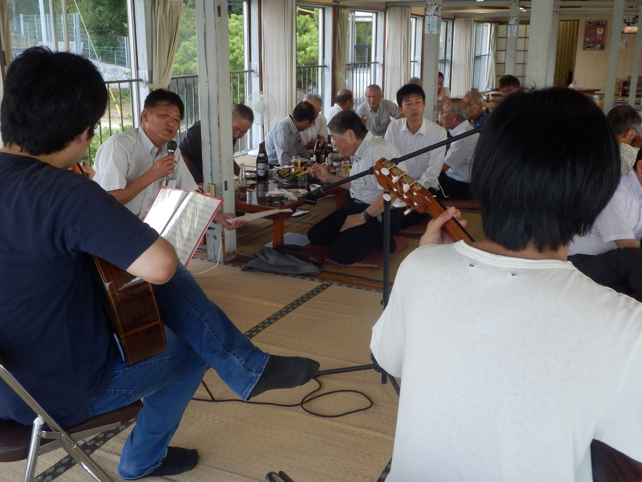 美味しい瀬戸内海の魚や美味しい地元のお酒をいただきながら、リオデジャネイロオリンピックの高見澤選手の話や学生時代の思い出話等々で盛り上がる中、森實岳志(人社4年)リーダー率いるギタークラブの登場となった。