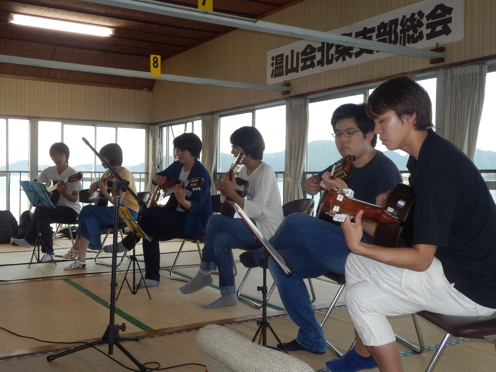 【あとがき】今回のギタークラブの参加は2017年1月8日が温山会創立90周年にあたり、プレ90周年事業として「学生と温山会員との交流」の一環としての企画だった。昭和の名曲をともに歌い楽しい夜を過ごすことができた。6名のギタークラブの学生は、1名が広島県出身、5名が県内出身。北条鹿島は初めて訪れる土地だった。総会開始前にリハーサルを行った後、海水浴場やキャンプ場等の島探検もできたようで有意義な時間を過ごせたのではないだろうか。夕暮れの鹿島そして風早の地北条で生活する先輩方との交流が学生時代の素晴らしい思い出になったことだろう。ともかくも受け入れていただいた北条支部の皆様、暑い中、新ジャンルへの挑戦をしていただいた学生にも感謝・感謝の支部総会でした。ありがとうございました。