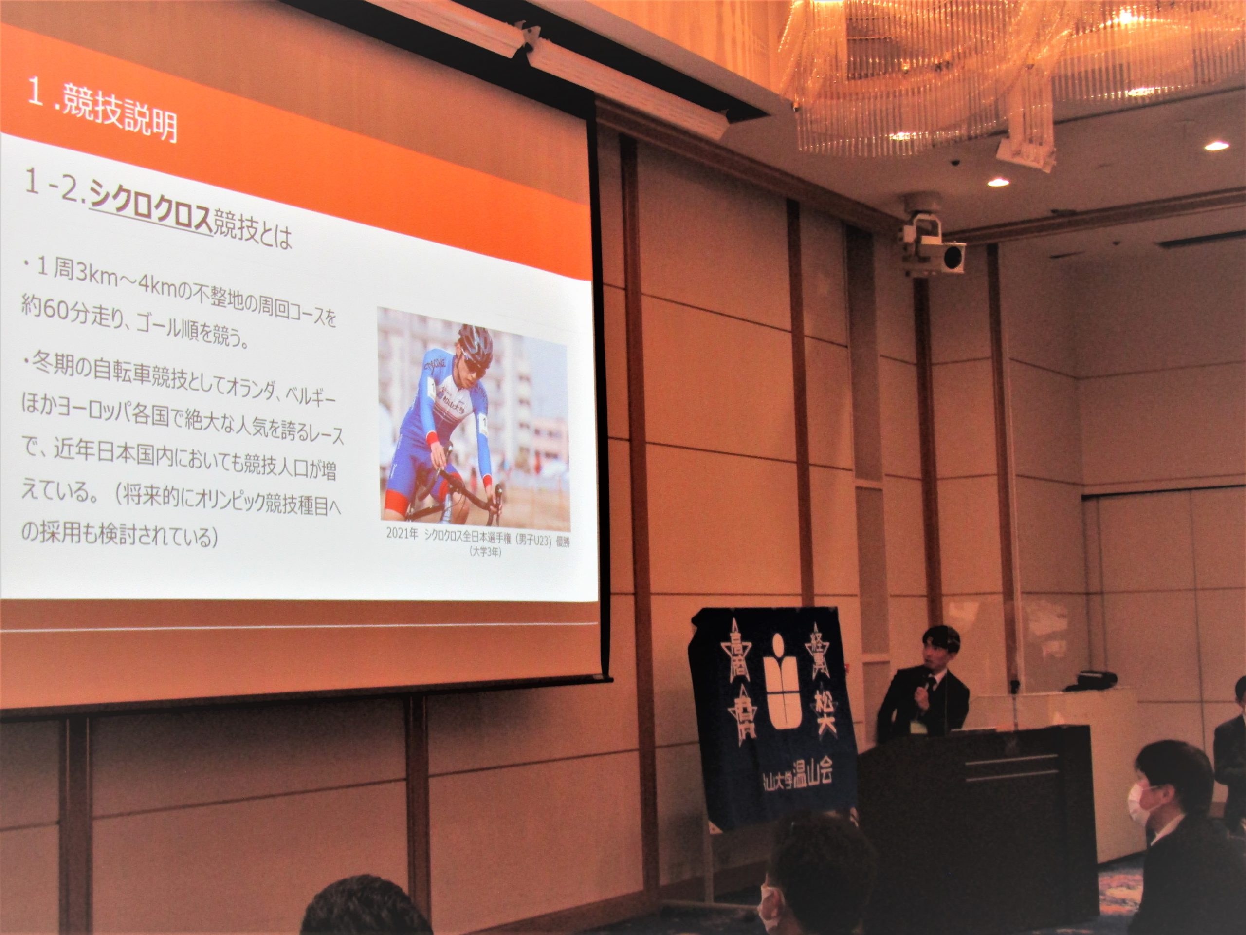 会食終了後は、村上さんから「2024パリオリンピックに向けて」という演題で講演をいただきました。自転車競技を始めた経緯やこれまでの戦績のほか、オリンピックの正式種目となっている「マウンテンバイク・クロスカントリー」という競技でパリオリンピックを目指しており、出場枠のポイント獲得のために国際大会が多く開催されるヨーロッパへの遠征を計画していること。また、その遠征に対する支援のお願いなどについてお話しいただき、参加者は熱心に聴き入るとともに今後の後輩の活躍に期待を膨らませていました。
