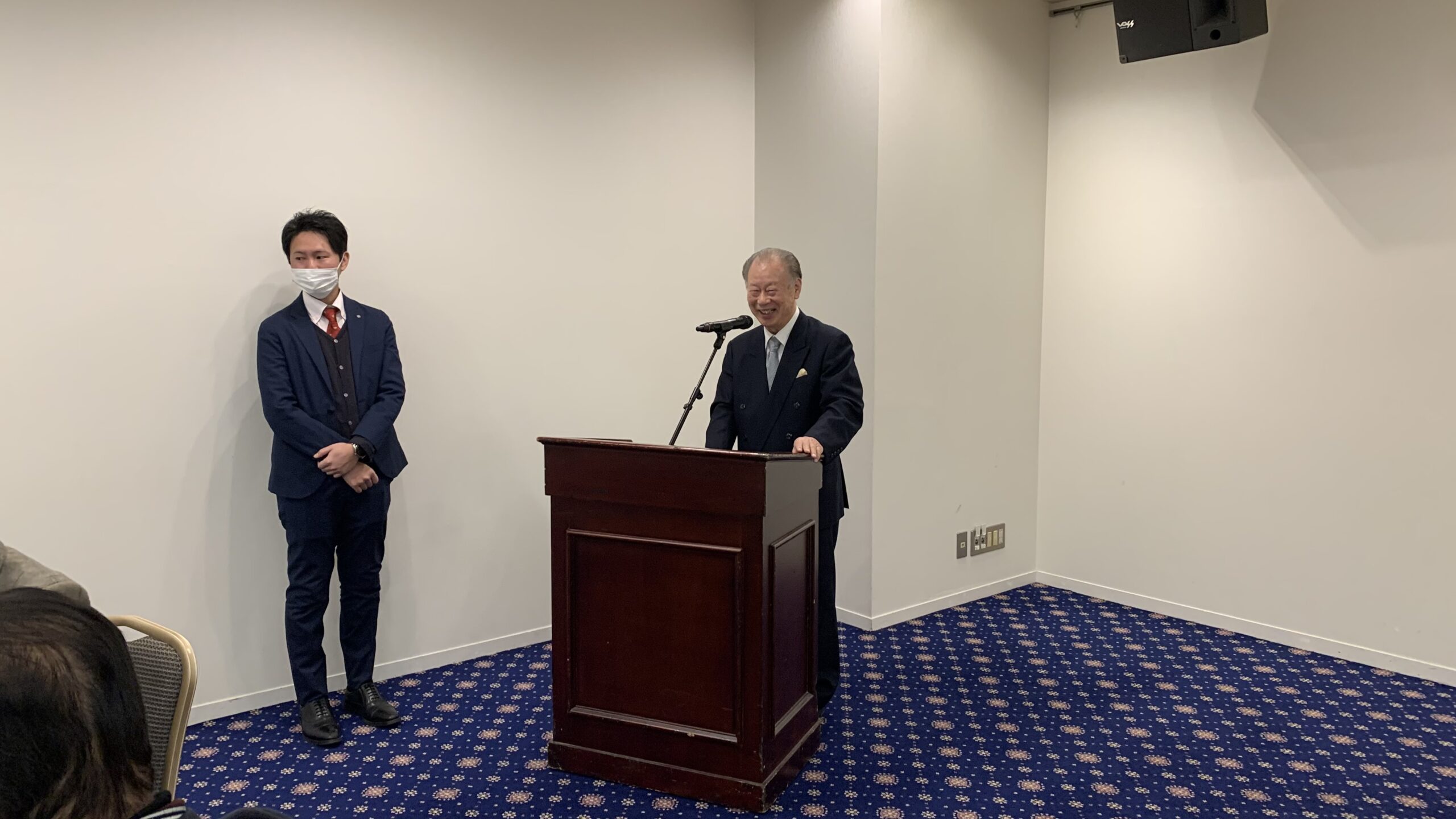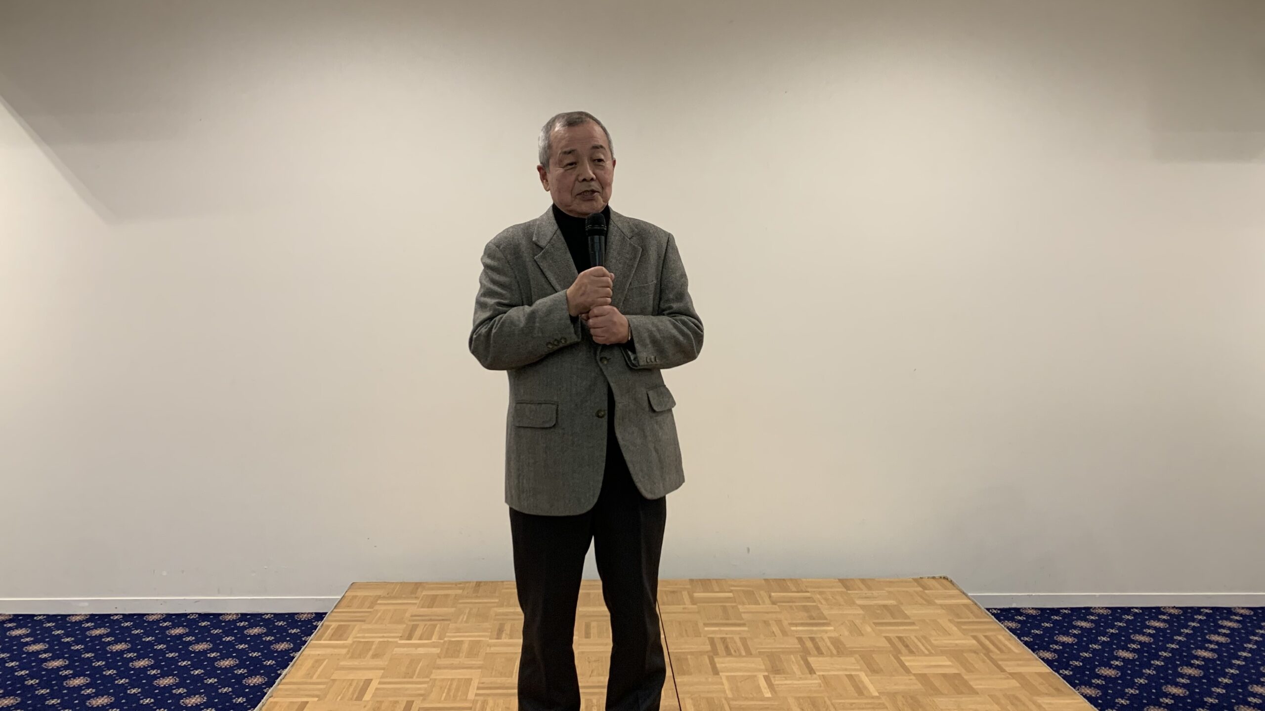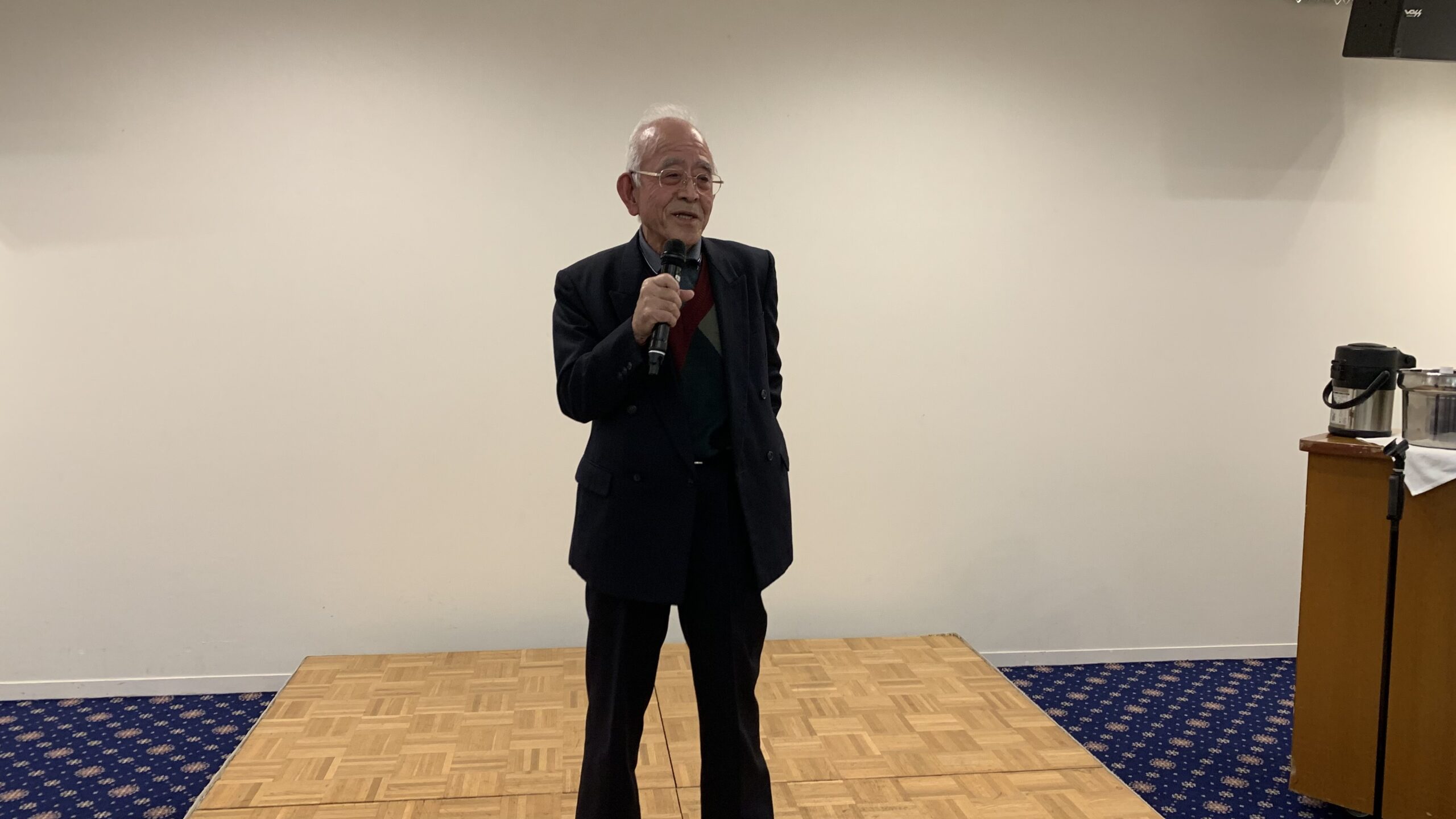 開会に先立ち、松大会会長の中本巌先輩より、「ゴルフが上り調子で80を切れるのではないかという思いも出てきた。」と元気な近況についてご挨拶をいただきました。また、新たな趣味も模索されており、ギターが良いか、書道が良いか、参加者の皆さまに問いかける場面もあり、いつまでも若々しい中本先輩です。