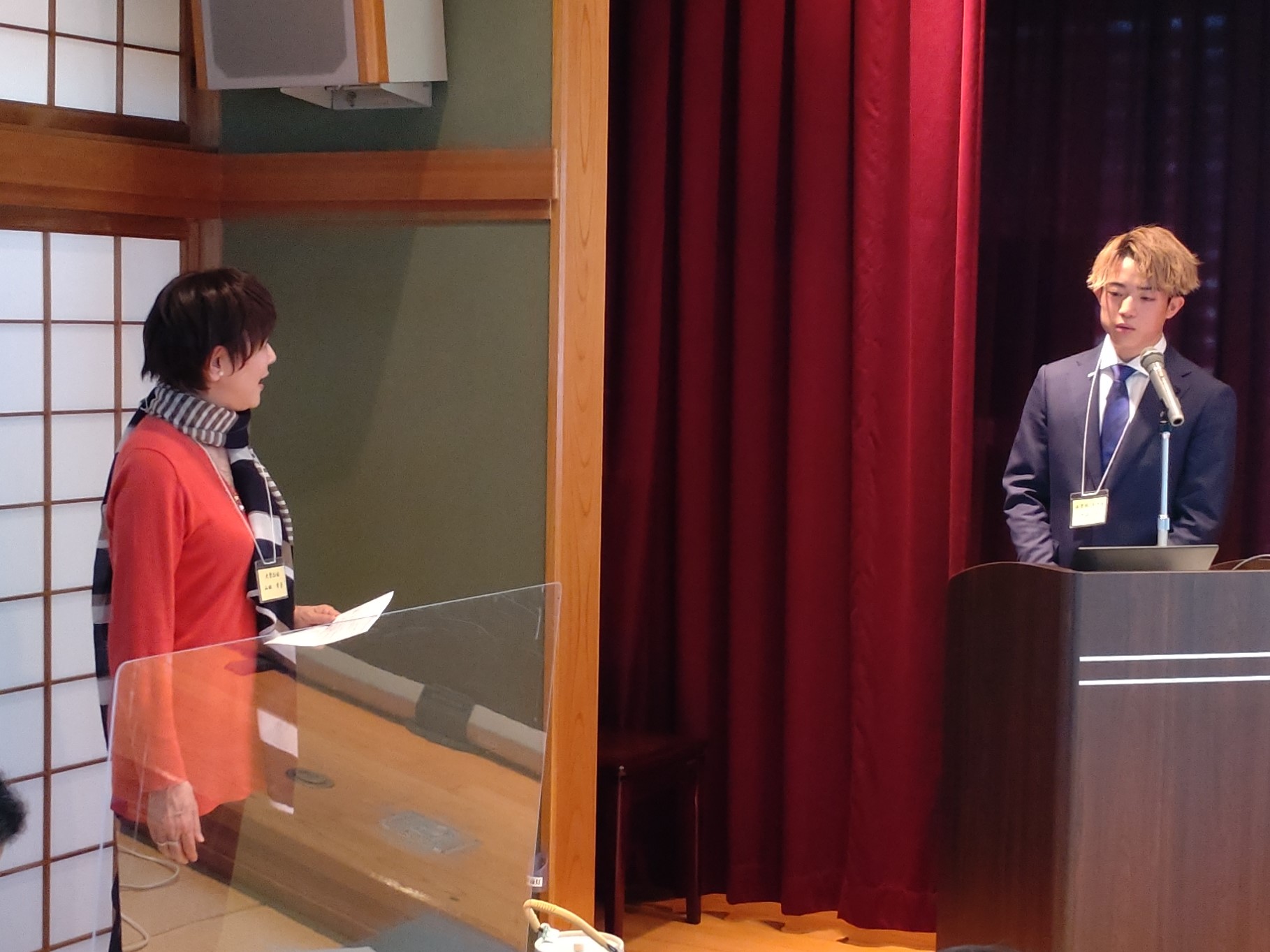 大政さんは、「松山市出身で今年21歳になります。小学5年生の時に友達に誘われてクライミングのジムに行き、高さ15メートルの壁を登り切った時の達成感が忘れられず、それを機にスポーツクライミングにはまっていきました。スポーツクライミングには『リード』、『ボルダリング』、『スピード』の3種目の競技がありますが、私はタイムを競う『スピード』を得意としており、この種目でパリオリンピックを目指しています。これからオリンピック選考大会など大事な試合が始まりますが、温山会の皆様も是非支援していただきますようよろしくお願いします」とスポーツクライミングを始めたきっかけやこれまでの大会での実績、オリンピックに向けた夢や活動への支援のお願いなどについて熱く語っていただきました。