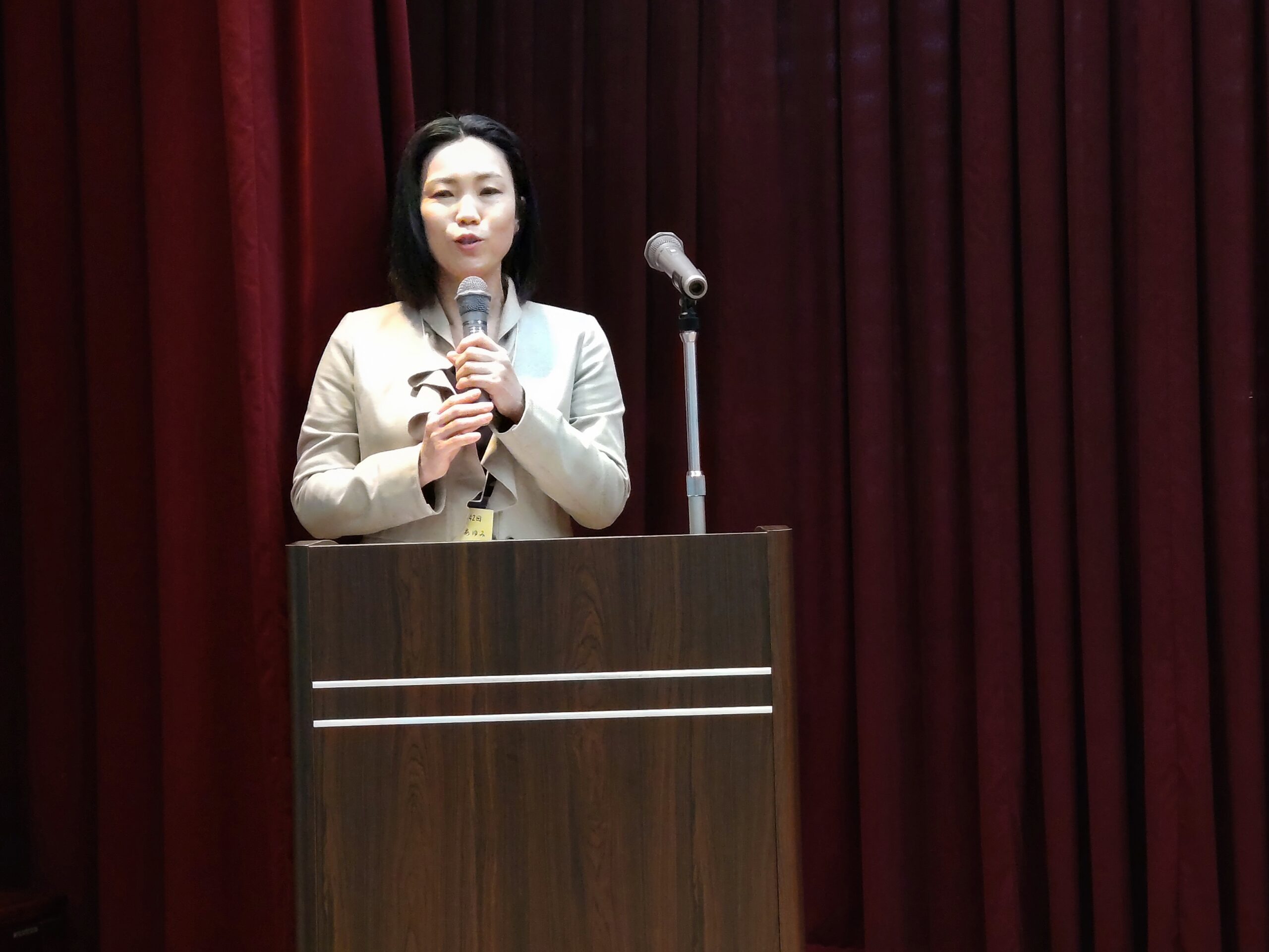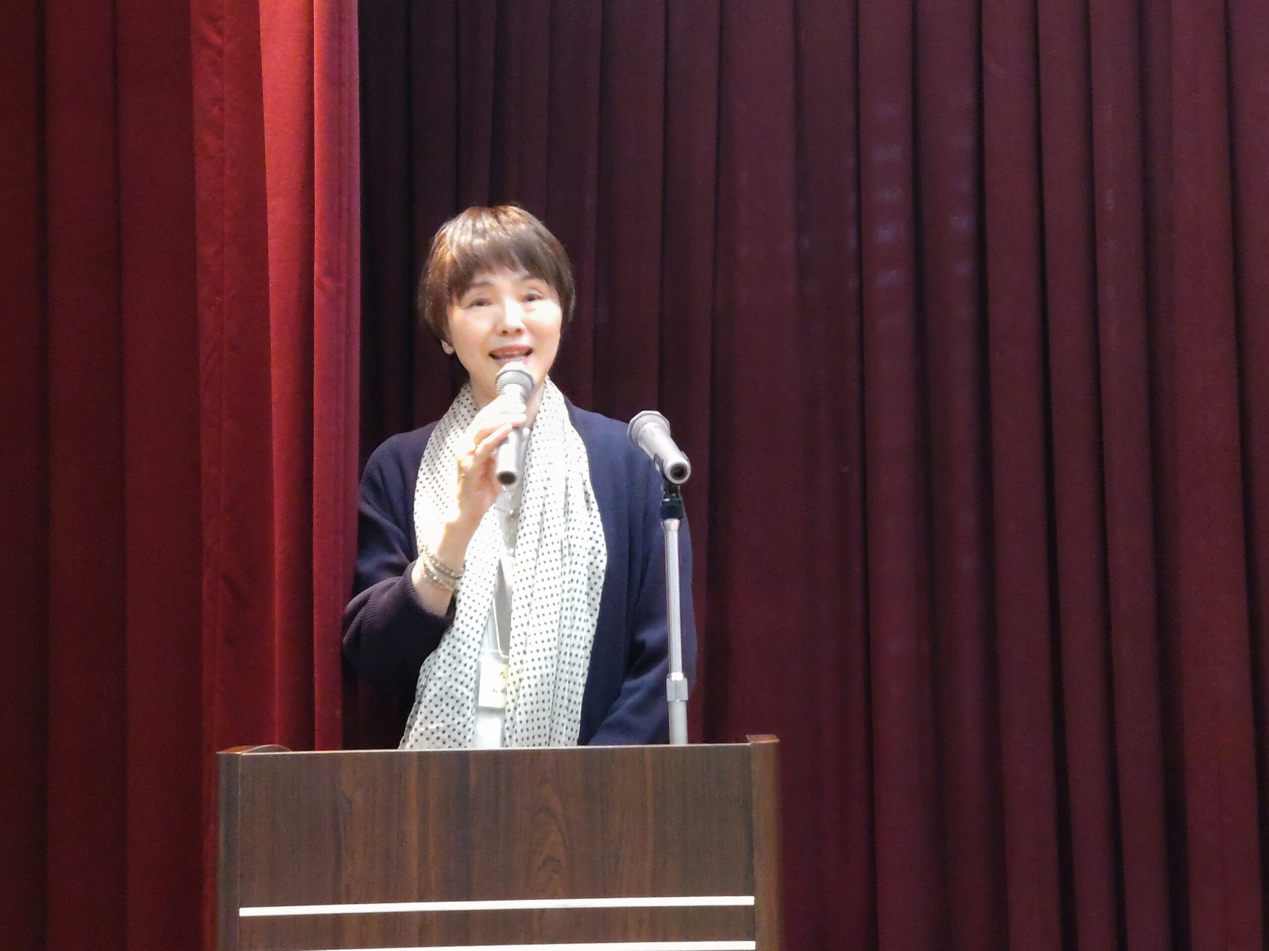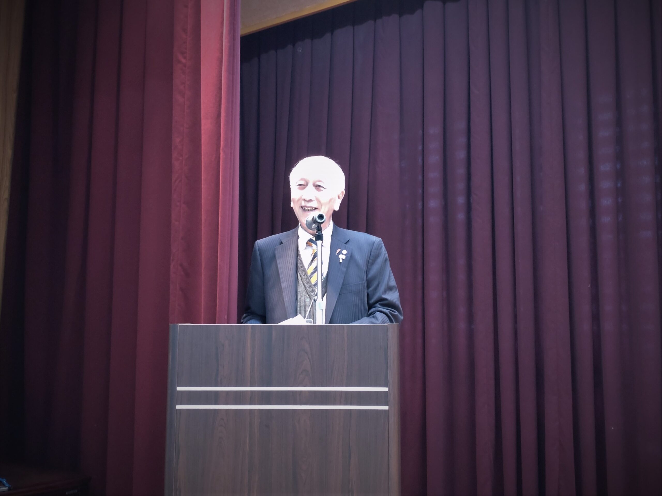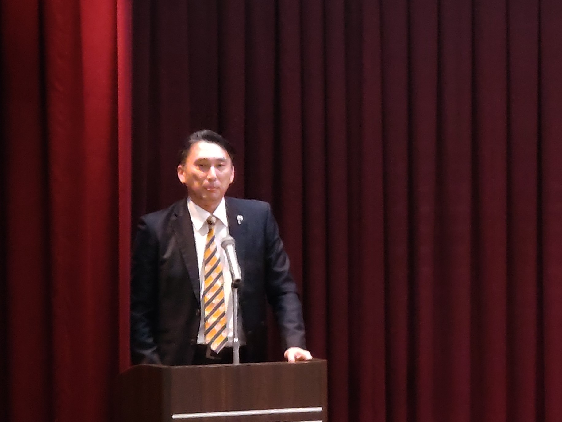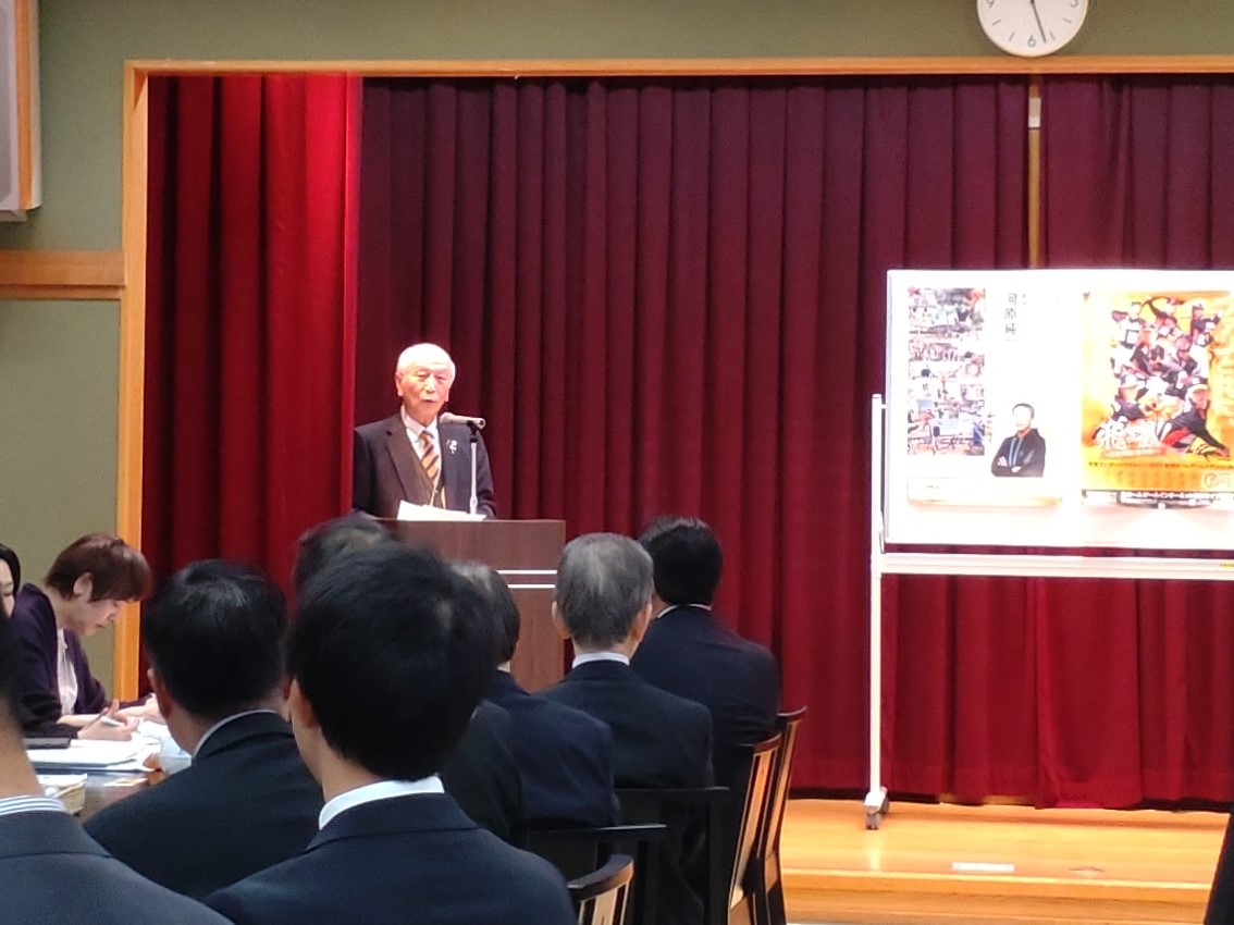 まず、山田幸子事務局長から「会員の皆様には5月22日開催の温山会総会・松山支部総会に多くの方に集っていただくようご尽力いただいていることと思いますがよろしくお願いします。本日は、愛媛県民球団株式会社代表取締役の薬師神績氏(大20)にお話いただきますのでよろしくお願いします」とご挨拶がありました。