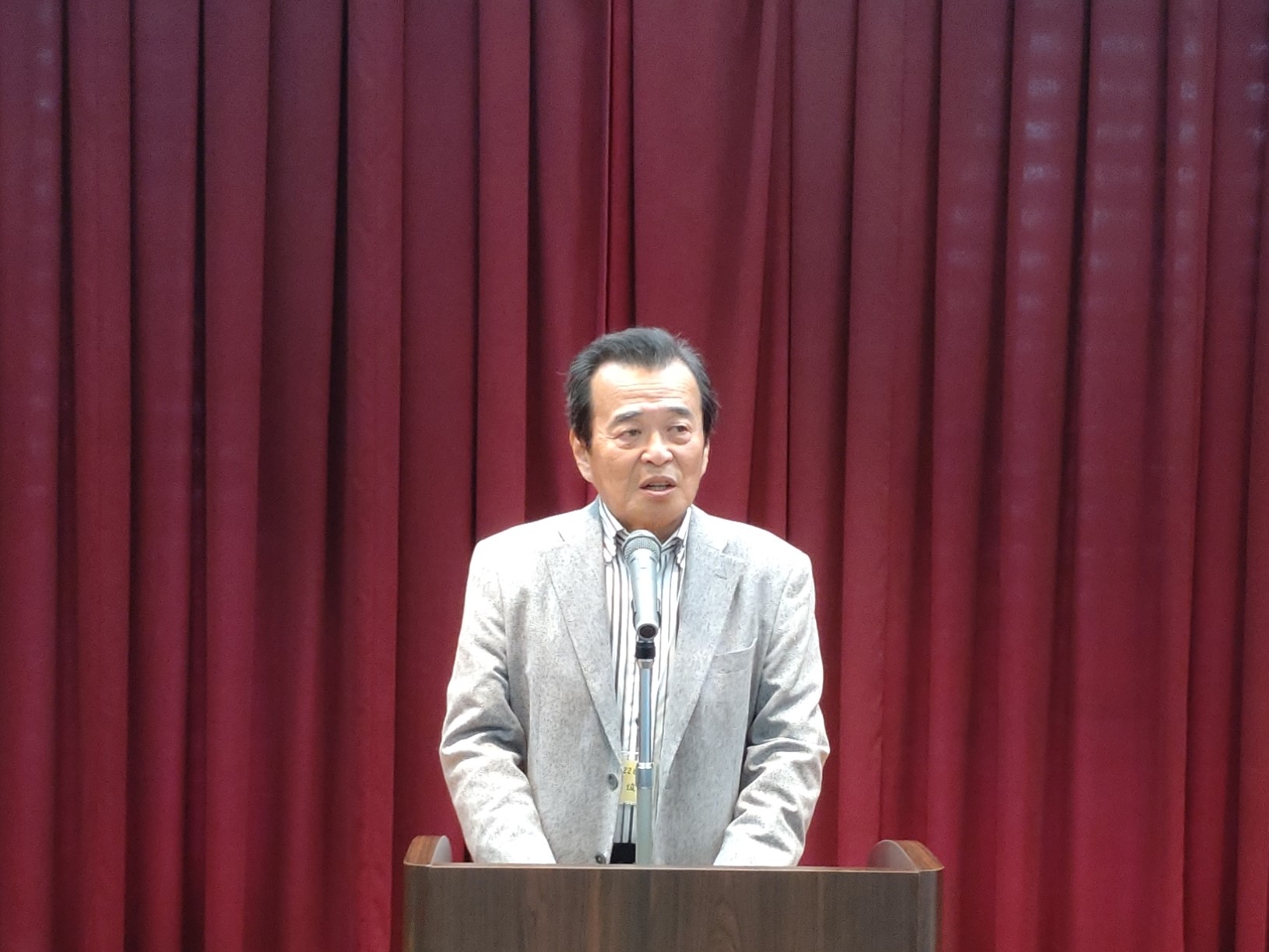 まず、今井俊朗松温会会長から「先月に温山会総会・松山支部総会が開催され盛会のうちに終えることができました。10月には大学創立100周年記念式典・祝賀会が開催されます。また、11月18日には温山会と大学の共催で「ホームカミングデー」を開催し、皆さんに楽しんでいただけるようなイベントを計画していますのでご参加、ご協力をお願いします。さて、本日は岡田印刷株式会社代表取締役社長の桑波田健氏に『松山に住んで半世紀』という演題でお話いただきます。よろしくお願いします」とご挨拶がありました。