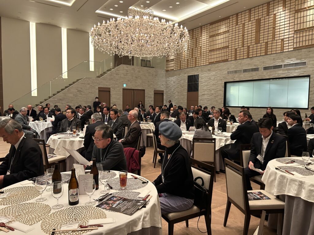 劇団玄喜座による殺陣アクションの観客参加型撫で斬りショーで大いに盛り上がりスタートした。今井松松山支部長から今年も様々なイベントを企画しておりますので、皆さまの多数のご参加をお待ちしていますとの挨拶の後、秋山 剛克氏(大学40)の乾杯により開宴した。会は盛会に進み、締めは岡田翔偉氏(大学73)による発声でお開きとなった。(参加者105名)